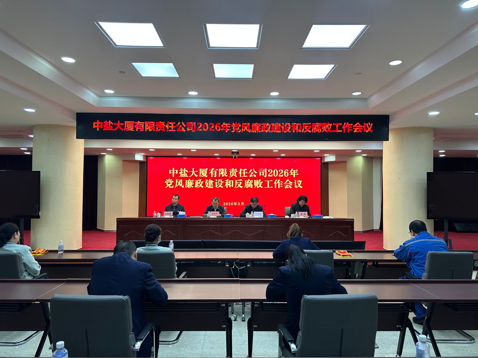 3月4日,中盐大厦召开2026年党风廉政建设和反腐败工作会议。会议深入学习贯彻习近平总书记关于党的建设的重要思想、关于党的自我革命的重要思想,全面落实党中央、国务院国资委党委和集团公司关于全面从严治党的部署要求,总结2025年工作成效,明确2026年重点任务。中盐大厦党支部书记刘明军出席会议并讲话,副总经理石庆贺传达了集团公司党风廉政建设和反腐败工作会议精神。会议由中盐大厦副总经理李琳主持。